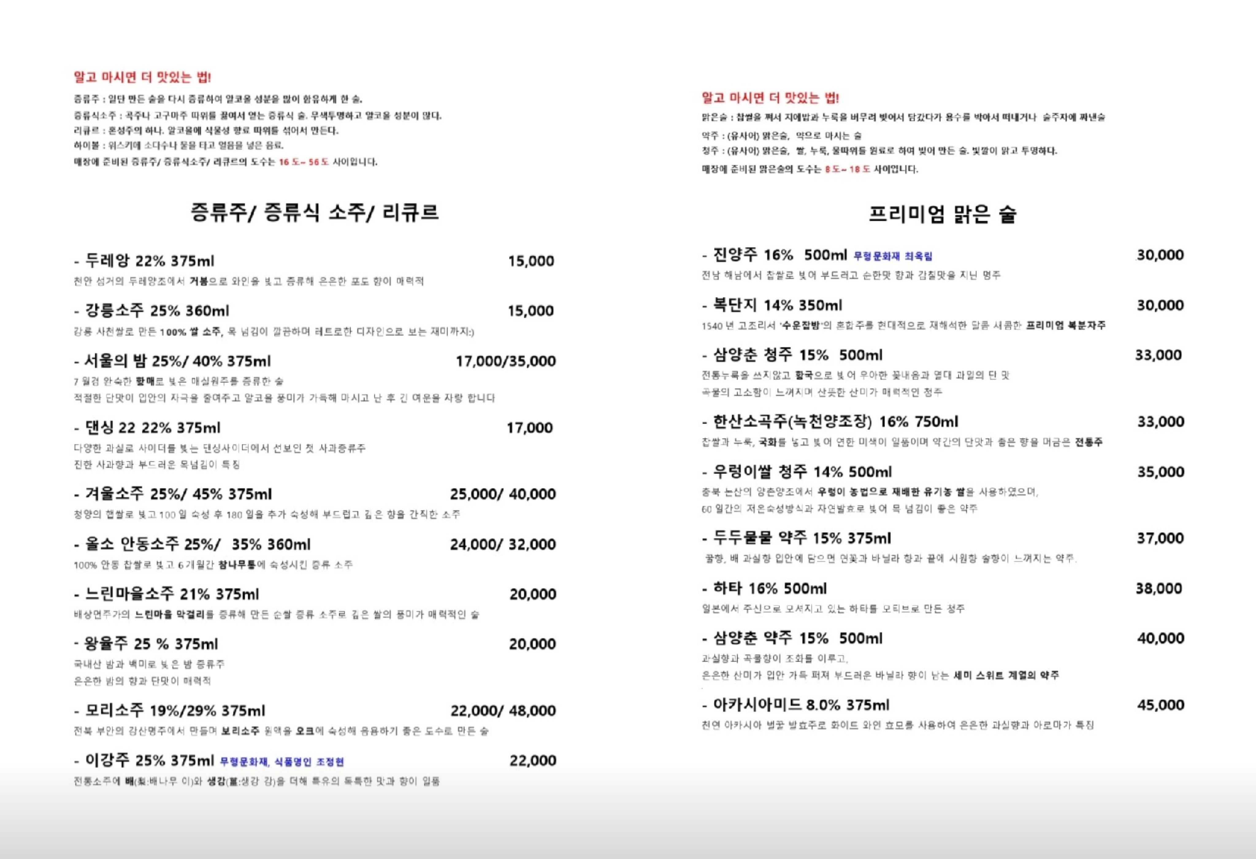 여러 지역의 대표 소주들과 청주와 같은 맑은술도 종류별로 있으니 취향에 맞게 선택하면 좋을 것 같습니다.