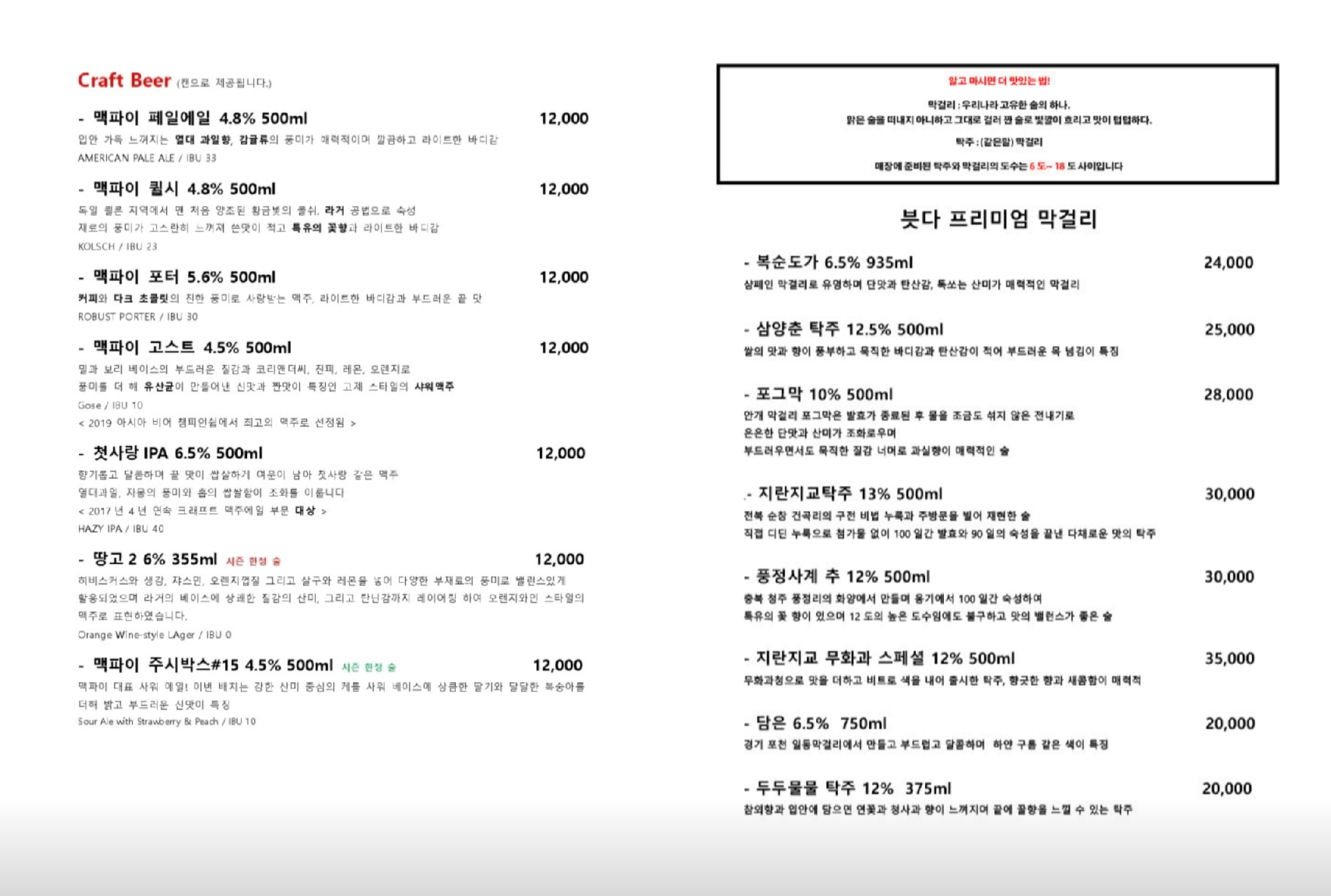 여러 맥주와 다양한 종류의 프리미엄 막걸리가 있습니다. 장수, 지평 막걸리 등 평소에 자주 접하는 막걸리가 아닌 특색 있는 막걸리가 많습니다.