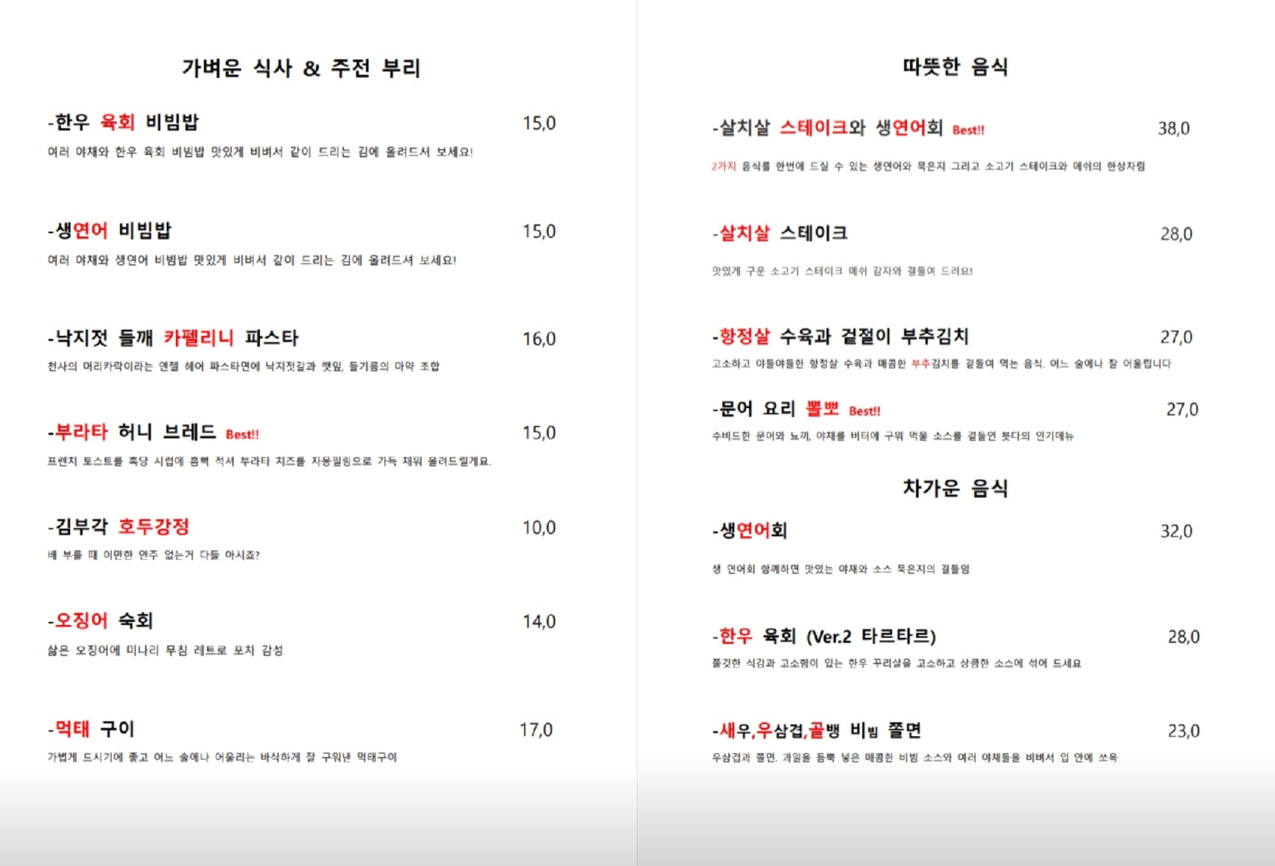 술이 곁들여지는 약속자리라면 국물 요리는 꼭 하나 있으면 좋은데요, 위 메뉴판과 같이 다양한 국물 요리가 있습니다.