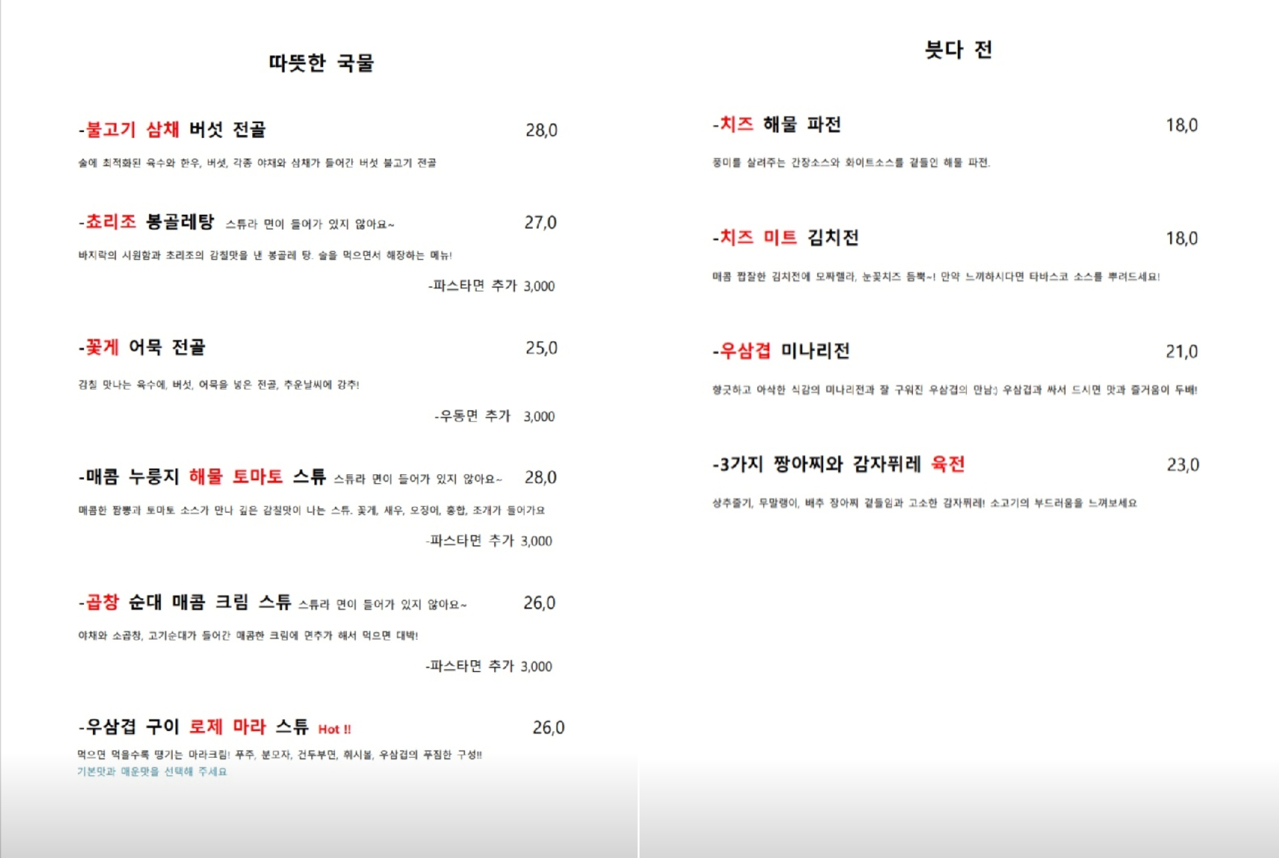 먼저 따뜻한 국물 요리류입니다.